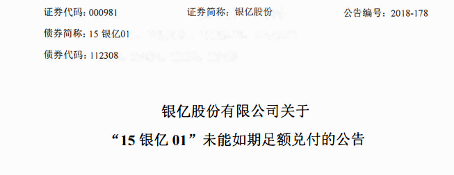 2018年12月24日,上市公司银亿股份公告称,旗下的“15银亿01”债券未能如期兑付,涉及金额3亿元。