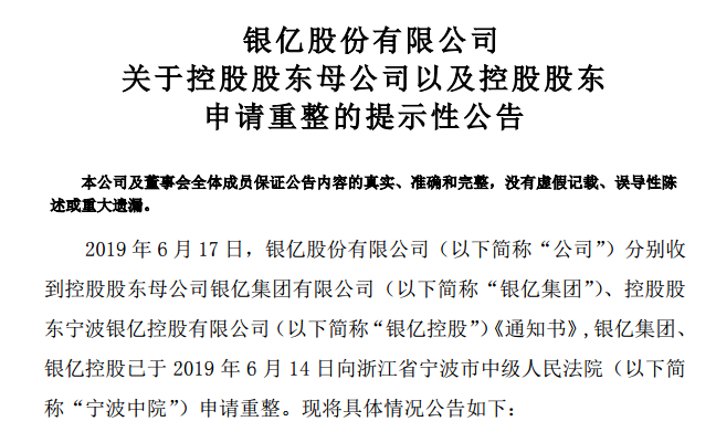 过了2个月,2019年的6月17日,银亿股份突然发布公告称,银亿集团、银亿控股已于6月14日向宁波市中级人民法院申请破产重整。