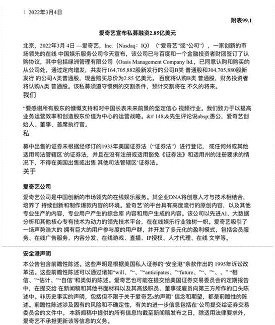 3月4日晚,爱奇艺宣布,已与百度百度及包括Oasis Management CompanyLtd.在内的投资者财团签订认购协议。