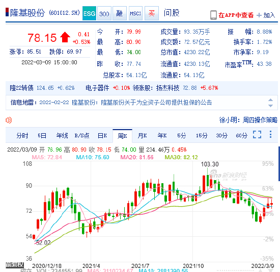 二级市场上,隆基股份股价自去年11月5日到达历史高点后开始震荡回撤,今年2月中旬止跌,随即在大盘走弱的情况下逆势上行。截至收盘,公司股价报78.15元/股,最新市值4230.22亿元,现有股东63.25万户。