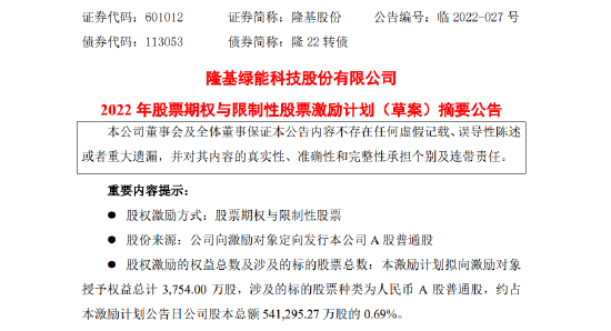 隆基股份:推总计3754万股股票期权与限制性股票激励计划