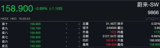 上市首日,蔚来开盘报160港元/股,盘中最高股价169港元/股,涨超5%。截至收盘,蔚来高开低走,报收158.9港元/股,总市值2652.05亿港元(约合人民币2143亿元)。