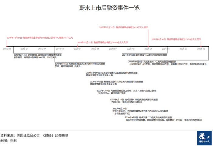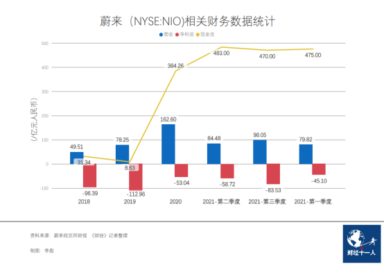 根据招股书,2018年、2019年、2020年及截至2021年9月30日的九个月里,蔚来分别产生净亏损人民币96.39亿元、112.96亿元、53.04亿元及18.74亿元。此外,尽管蔚来在2020年和截至2021年9月30日的九个月产生了正经营现金流,但是在2018年和2019年的经营活动现金流分别为负79.12亿元和87.22亿元,并且在2021年二季度和三季度的经营现金流为负。