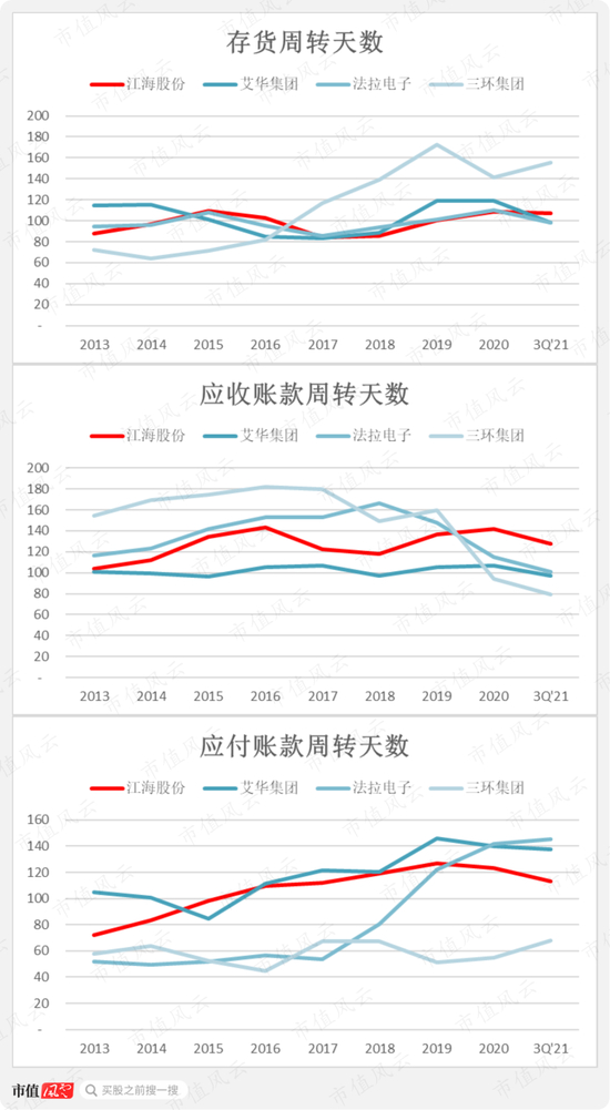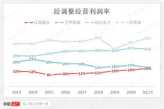 当然,如果看近处,以2021年前三季度表现为例,那么三环集团一马当先,达到67%,法拉电子为51%,略高于公司的48%,艾华集团垫底,为36%。
