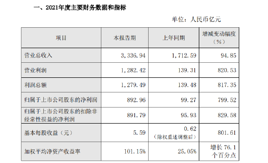 3月10日晚间,中远海控发布2021年度业绩快报公告,报告期内营业收入为3336.94亿元,同比增长94.85%;净利润892.96亿元,同比增长799.52%;基本每股收益5.59元。