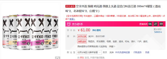 目前该公司仅有一款“空卡苏打酒”产品上市。在空卡京东自营旗舰店,350ml6罐装的空卡苏打酒售价为61元,每罐平均10元。