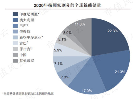 镍矿分为红土镍矿和硫化镍矿两种。红土镍矿主要分布在印尼、巴西、新喀里多尼亚、古巴和菲律宾,硫化镍矿主要分布在俄罗斯和中国。