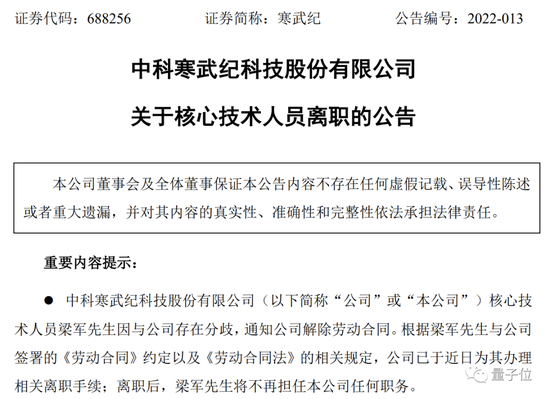 因为这则公告官宣的是:公司核心技术骨干、CTO梁军,离职。