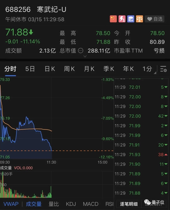 截至发稿,寒武纪股价报71.88元,跌幅达11.14%,市值蒸发约36亿人民币。