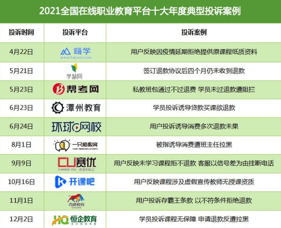 在年度十大典型投诉案例中,恒企教育以“学员投诉课程无保障,申请退款反遭拉黑”上榜。