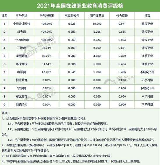 3月10日,网经社电子商务研究中心发布《2021年度中国在线职业教育消费投诉数据与典型案例报告》:退款投诉比重超六成,网络欺骗、霸王条款、虚假促销等顽疾滋扰用户。在“2021年全国在线职业教育消费评级榜”中,嗨学网获“不建议下单”评级,恒企教育获“不予评级”评级。