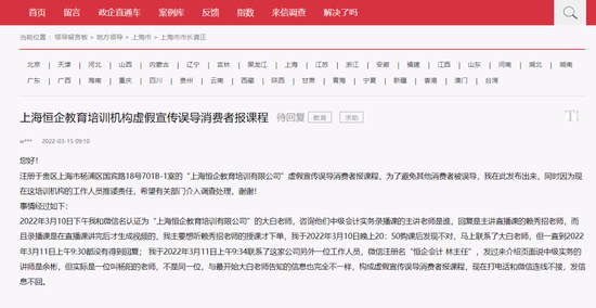 近日投诉也不缺。2022年3月15日,有用户在人民网领导留意板投诉,恒企教育实际授课老师不符,涉嫌虚假宣传、误导消费者报课。