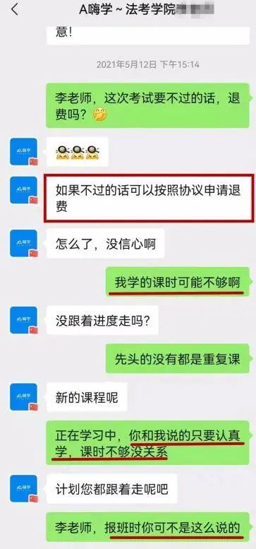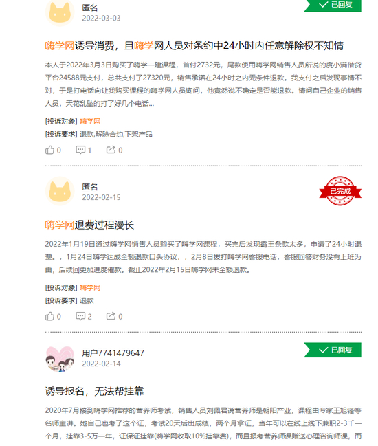 彼时,有大量消费者投诉嗨学网,称其销售当面说一套,协议背后签一套,不少消费者被所谓“保过班型,签订不过退费协议”“一科不过,100%保障退费”“100%保障顺利报名”等诱导买课,结果退款困难重重。