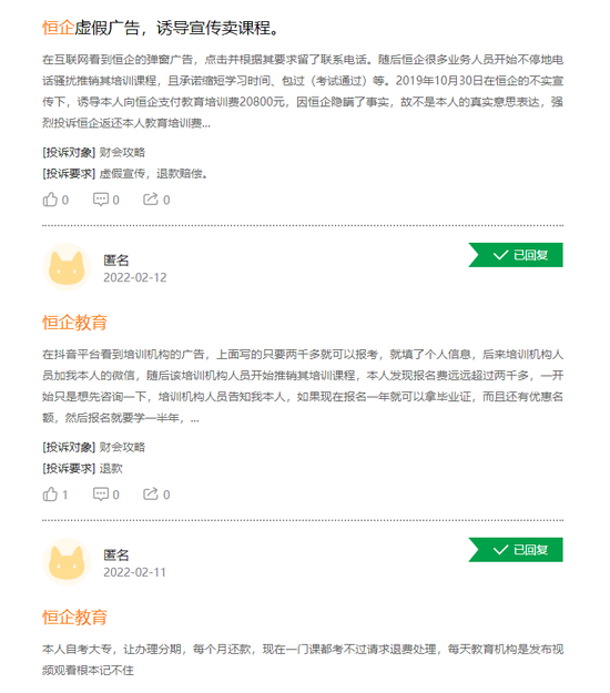 浏览黑猫投诉,截至3月18日14时,恒企教育相关投诉共有2744条,“诱导”卖课、虚假宣传、教学服务质量不佳、退费纠纷等亦是焦点。
