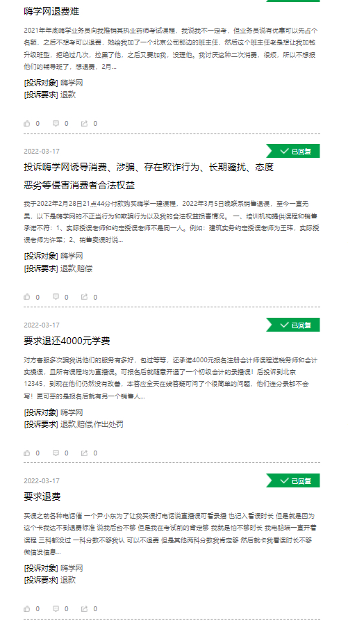 2022年3月9日,网经社教育台(EDU.100EC.CN)发布十大典型投诉案例,第一个就是嗨学网,投诉案例为“用户反映因疫情延期拒绝提供原课程纸质资料”。