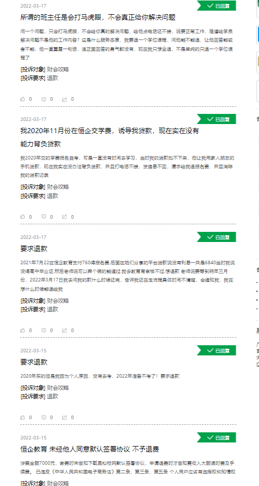 而中国科技投资也曾报道,江西学员张云(化名)称,报名恒企教育的“VIP签约保障班(自考)”后,不仅背上网贷,成人自考也与恒企工作人员描述的“报名后会分发押题资料,保证‘一考即过’”不一致,难以通过。申请退款遭拒。