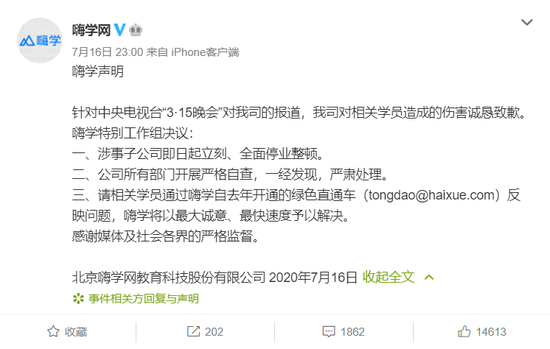 被点名后,嗨学网表示,成立特别工作组,对相关事件展开调查,对涉事子公司进行停业整顿。