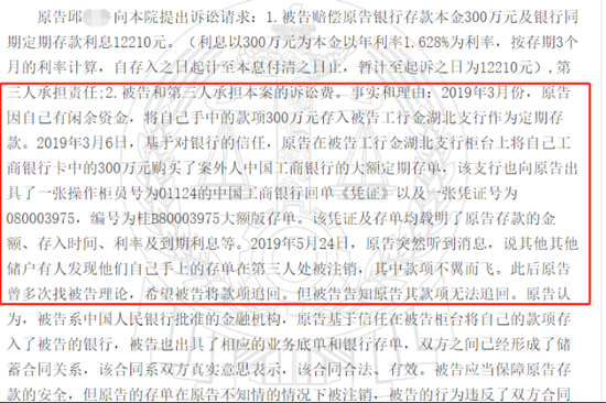 红星资本局检索到的一份裁判文书显示,2019年3月6日,邱某在工行广西分行金湖北支行存入300万元购买了大额定期存单,该支行向邱某出具了工行回单《凭证》以及大额版存单。该凭证及存单均载明了邱某存款的金额、存入时间、利率及到期利息等。但在2019年5月24日,邱某也听到了上述存单是假的消息。此后其多次找工行希望追回款项,但工行告知该款项无法追回。