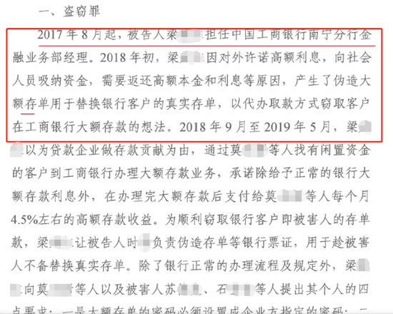 南宁市人民检察院的一份指控显示,梁某某从2017年8月起担任工行南宁分行金融业务部经理。2018年初,她因对外许诺高额利息,向社会人员吸纳资金,需要返还高额本金和利息等原因,产生了伪造大额存单用于替换银行客户的真实存单,以代办取款方式窃取客户在工行大额存款的想法。