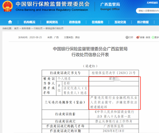 红星资本局查阅发现,2020年8月18日,广西银保监局发布文号为“桂银保监罚决字〔2020〕21号”的行政处罚决定书。梁某某由于严重违反银行业金融机构从业人员职业操守,涉嫌犯罪依法被逮捕起诉,被给予“禁止从事银行业工作终身”的行政处罚。该银行相关人员也受到了相应处罚。