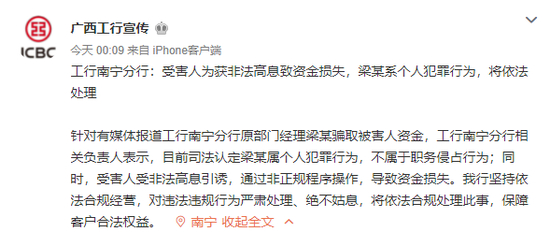 3月18日,“广西工行宣传”在微博公开回应称:目前司法认定梁某某属个人犯罪行为,不属于职务侵占行为;受害人受非法高息引诱,通过非正规程序操作,导致资金损失。该行还表示,将坚持依法合规经营,对违法违规行为严肃处理、绝不姑息,将依法合规处理此事,保障客户合法权益。