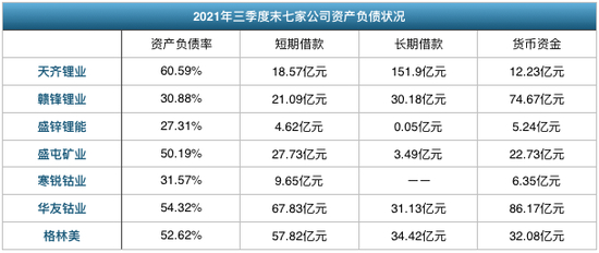 从上图可以看到,虽然七家公司资产负债率大都不算特别高,但对比借款,手中的货币资金并不宽裕,这还是上市之后,他们频繁再融资的情况下。特别是连续两次大额并购的天齐锂业,一度陷入百亿级债务危机,不过2021年业绩回暖,能缓解一些压力。
