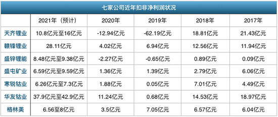 从业绩来看,随着新能源汽车的爆发,能源金属上市公司们正迎来收获期,2021年,均取得了亮眼的成绩,多家公司扣非净利润出现数倍的涨幅。