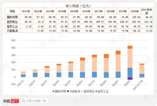 从收入构成来看,医药商业占比最大,其次是国际贸易业务,医药工业收入最小。