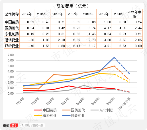 由医药工业延伸出药品研发情况,中国医药在5家公司中研发费用较低的公司之一,仅高于东北制药,与以岭药业相比,差距非常大。