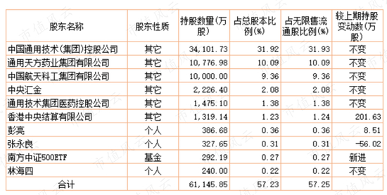 2021年三季度末,前十位股东包括中国通用技术(集团)控股公司、通用天方药业集团有限公司,以及通用技术集团医药控股公司一致行动人在内合计持有6.11亿股,持股比例为57%,二级市场流通比例对应43%。