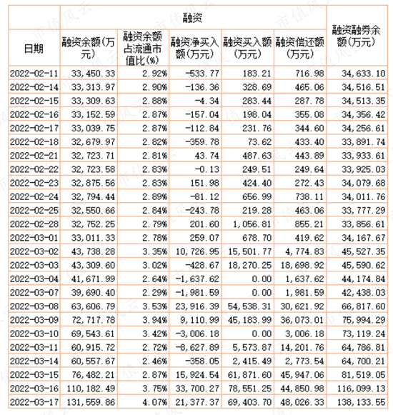 融资规模在2022年2月2日开始增加,当天融资净买入超过1亿元,3月8日再次增加2.4亿元,而在10日、11日两天连续减少近1.2亿元。3月15日至17日连续三天增加,合计增加7.1亿元,同时,这三天的融资买入、融资偿还规模比较大,单日均超过4亿元,是2021年2月以来整整1年时间里最大的单日买入、偿还规模。