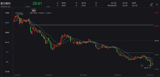 2021年7月,爱尔眼科的股价飙涨到72.27元/股后便持续下挫。截至3月21日收盘,该公司股价报收于28.49元/股,总市值为1540亿元。9个月时间,爱尔眼科股价累计跌幅超60.58%,目前市值距其7月高点的3600亿元已蒸发超2000亿元。