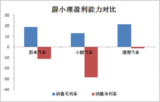 就拿蔚小理三家新势力做个比较,从最近一期的财报可以看到,理想汽车毛利率为21%,领先于蔚来汽车(19%)和小鹏汽车(13%);同时,理想汽车净利率为-1%,同样领先蔚来汽车(-11%)和小鹏汽车(-29%)。
