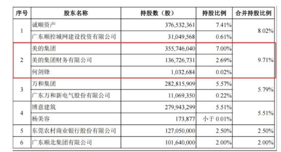 何剑峰还携手美的入股了有着顺德“金库”之称的顺德农商行。目前该银行正在准备IPO,《招股书》显示,第二和第五大股东为美的集团、美的财务公司,何剑锋个人持股0.02%,三者合计持股9.71%,力压包括诚顺资产和广东万和集团在内的股东。