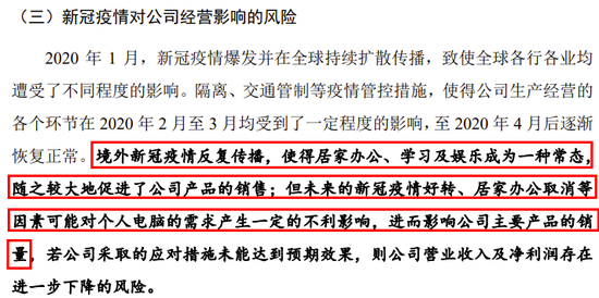 招股说明书(上会稿)披露了新冠疫情对公司经营影响的风险,竟然是境外新冠疫情缓解对公司是利空。招股书披露:境外新冠疫情反复传播,使得居家办公、学习及娱乐成为一种常态,随之较大地促进了公司产品的销售;但未来的新冠疫情好转、居家办公取消等因素可能对个人电脑的需求产生一定的不利影响,进而影响公司主要产品的销量。