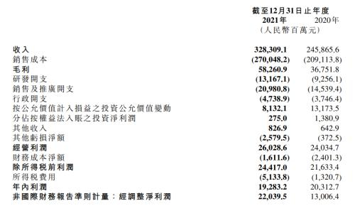 财报显示,2019至2021年,小米实现总收入分别为2058亿元、2459亿元、3283亿元,增幅分别为17.7%、19.5%、33.5%;经调整净利润分别为115亿元、130亿元、220亿元,增幅分别为34.8%、12.8%、69.5%。其中,小米2021年调整后净利润增速与上一年同期相比大幅增加,增加了56.7个百分点。