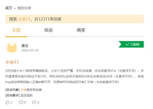 其中关于小米11的投诉达12311条,主要涉及故障、三包、不予退款、虚假宣传等问题。其中,多位用户投诉小米11的质量存在问题,包括手机发热严重、烧wifi、黑屏死机等。