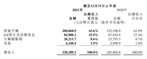 其中,智能手机业务对业绩作出重要贡献。2021年,全年小米智能手机收入达2089亿元,同比增长37.2%,占总营收的63.6%;出货量同比增长30.0%,达到1.9亿部。