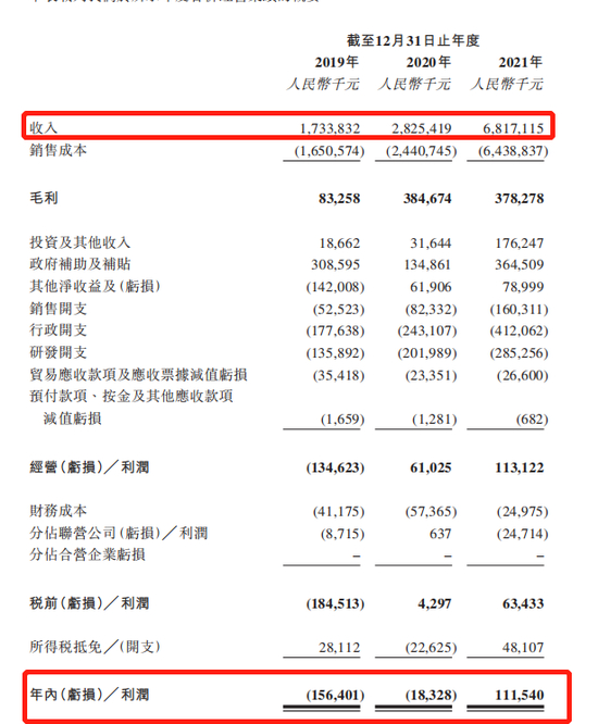 与行业老三地位有些不符的是,中创新航的利润微薄。招股书显示:2019年至2021年,中创新航营业收入分别为17.34亿元、28.25亿元、68.17亿元,净利润分别为-1.56亿元、-0.18亿元、1.12亿元。