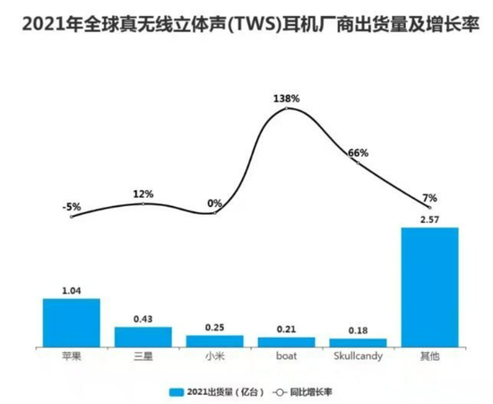 在头部厂商中,除了苹果之外,三星、小米的TWS耳机出货量同比增速也出现下滑,后者更是全年几乎全零增长。真正实现逆市增长的,只有Boat。