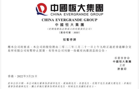 3月21日,中国恒大(3333.HK)发布停牌公告,同时停牌的还有恒大汽车(0708.HK)、恒大物业(6666.HK)。据FR资产界从部分债权人处了解,恒大将于本周召开全球投资者会议,以向他们介绍公司的重组框架(方案)。