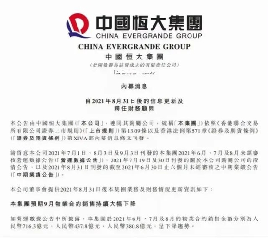 根据恒大集团发布的公告内容显示,从2021年6月份到8月份,2021年6月份到8月份,恒大集团物业合约销售金额分别为716.3亿元,437.8亿元,380.8亿元。