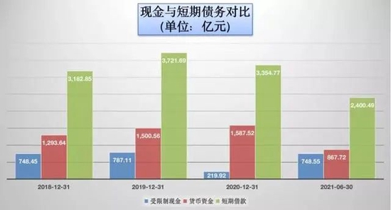 2021年呢,截至2021年半年报,恒大账上可灵活调度的货币资金只有868亿元,相比之下,一年内到期的短期负债高达2400亿元,只有后者的36%。即便加上受限货币资金749亿元,比例也只有67%。可以说,恒大账上的货币资金根本无法覆盖有息负债。