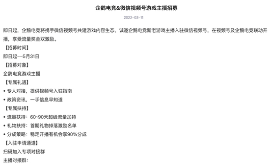 该招募公告持续至5月31日,对于企鹅电竞游戏主播入驻微信视频号,将提供专人对接,并享受60-90天的流量加持。在分成策略上,稳定开播的主播,有机会享受90%的分成。