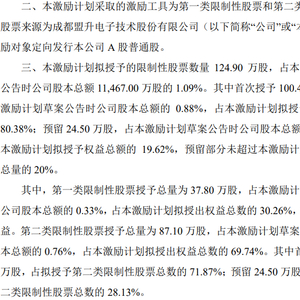 盟升电子2022年限制性股票激励计划(草案)显示,激励计划拟授予的限制性股票数量为124.9万股,占激励计划草案公告时公司股本总额的1.09%。其中,首次授予100.4万股,预留24.5万股。
