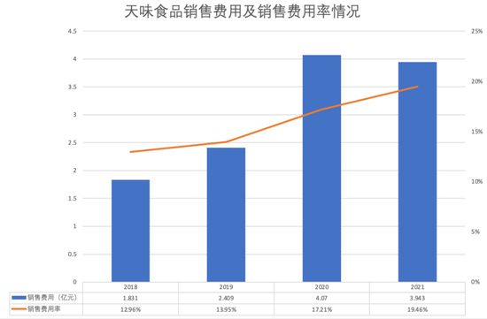 而从整体的销售费用情况而言,天味食品的销售费用在2020年增幅68.95%至4.07亿元,2021年有所下滑,支出3.94亿元。同时,销售费用率也逐年攀升,2021年达到19.46%。