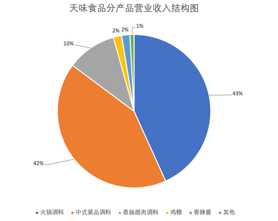 2021年年报显示,天味食品的主要产品为火锅调料、中式菜品调料、香肠腊肉调料,分别实现营业收入8.75亿元、8.49亿元、2.12亿元,占比43%、42%和10%。其中,除香肠腊肉调料同比增长111%以外,火锅调料和中式菜品调料分别下降28%和10%。