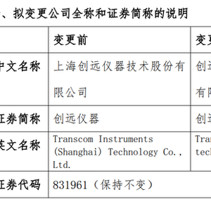 北交所公司创远仪器公告,根据目前主要产品、核心技术及优化后的战略规划以及新业务发展需要,公司拟变更全称及证券简称,其中证券简称将变更为“创远信科”。