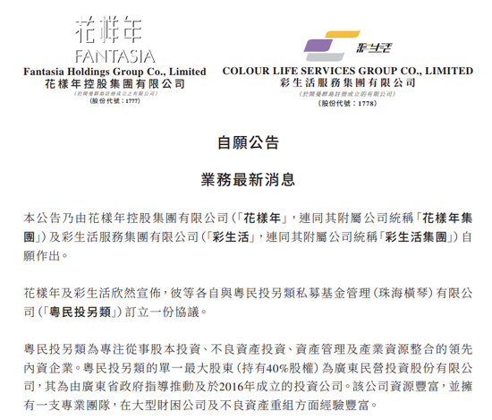 4月11日,花样年、彩生活(1778.HK)联合公告称,双方已各自与粤民投另类私募基金管理(珠海横琴)有限公司(简称“粤民投另类”)签订协议,粤民投另类将在增强花样年资产价值、落实花样年重组计划、优化彩生活资产及业务等多个方面为两家企业提供协助。