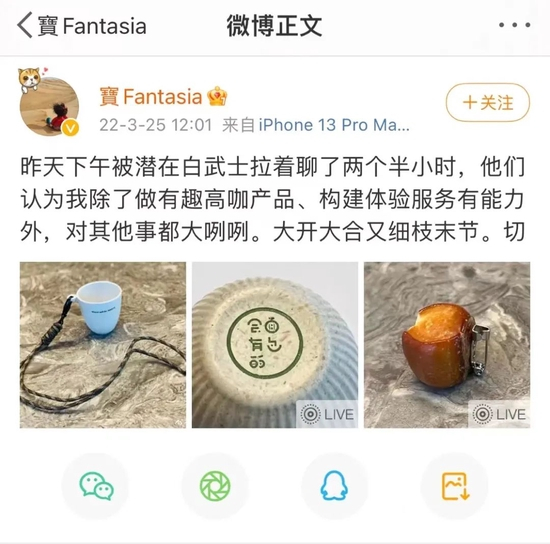 3月25日,曾宝宝在个人微博上讲述过其与潜在白武士接触一事。她提到,“昨天下午被潜在白武士拉着聊了半个小时,他们认为我除了做有趣高咖展品、构建体验服务有能力外,对其他事都大咧咧。大开大合还要细枝末节,切。”